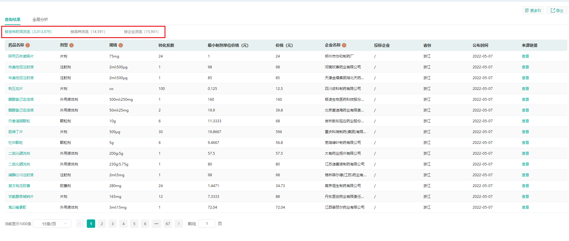 以药融云【药品招投标】数据库为例,全面升级了查询结果的统计呈现,查询结果可按发布时间浏览、品种浏览以及企业浏览三大板块进行展现,方便用户快速直观检索药品的剂型、规格、生产企业、转化系数、价格、中标数、企业数、最高/最低中标价格、品种数、品规数等信息。