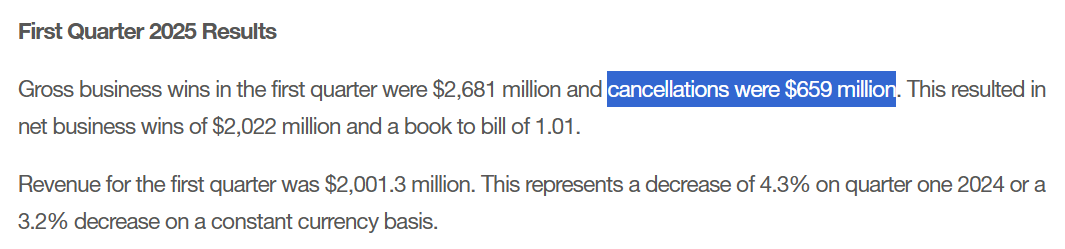 4月30日ICON公布了第一季度的业绩情况,总的营收为20.013亿美元,同比去年下降4.3%。低于William Blair分析师预期的20.4亿美元。公司第一季度总共获得26.81亿美元(约195亿人民币)的总订单,但其中6.59亿美元(约为 48亿人民币)订单遭到取消。