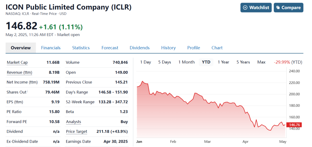 但ICON的第一季度财报披露之后,周四开盘其股票就下跌了5.5%。自2025年以来,ICON的股价最高达228.28美元,4月22日一度跌至今年最低133.28美元。同时ICON将2025年全年收入指引从2月公布的80-87亿美元区间下调至78-81亿美元低位区间。