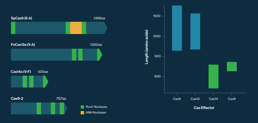 下图左比较了Cas14a和CasΦ-2核酸酶和较常用的Cas9和Cas12核酸酶结构域(RuvC和HNH),蛋白质长度按比例绘制;下图右比较了Cas14a-c和CasΦ系统和Cas12a-e和Cas9系统的长度分布: