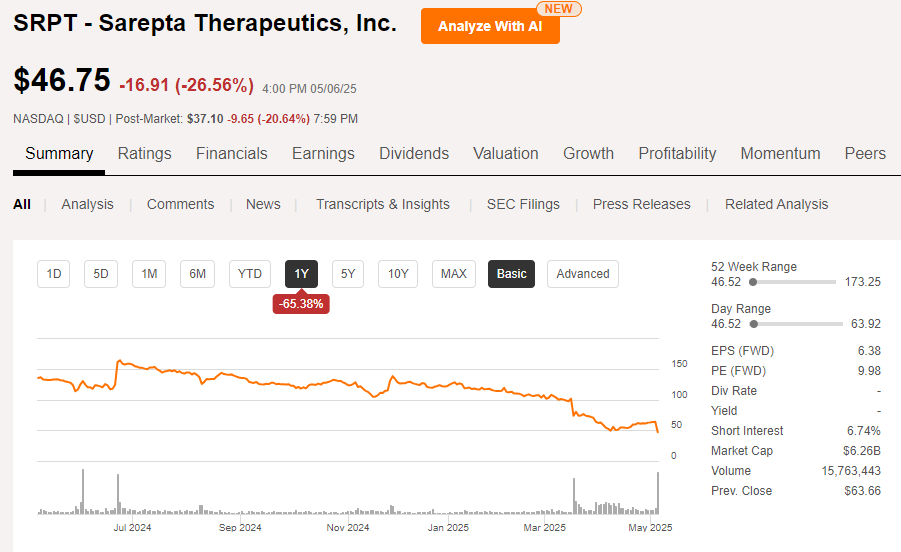 鉴于此,Sarepta公司股价在盘后暴跌近27%,目前市值为62.6亿美元。