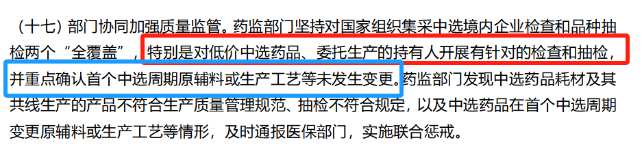 这一要求在第十七条再次强调,并明确对低价中选企业及涉及委托生产的持证人将开展专项检查,监管力度进一步加码。