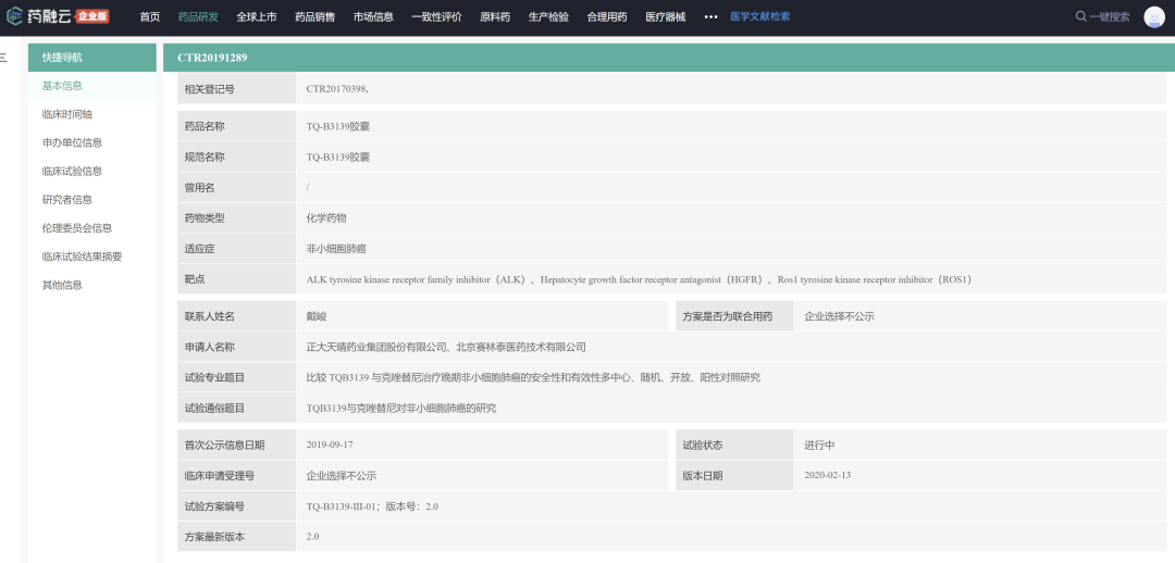 通过查询药融云数据库可知,TQ-B3139是一款ALK/c-Met/ROS1多靶点酪氨酸激酶抑制剂,并可查询到2019年注册的一项III期临床研究:比较 TQB3139 与克唑替尼治疗晚期非小细胞肺癌的安全性和有效性多中心、随机、开放、阳性对照研究。由此推测TQ-B3139此次报上市的适应症可能为晚期非小细胞肺癌(NSCLC)。