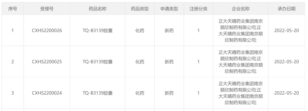2022年5月20日,药审中心承办了正大天晴药业集团南京顺欣制药有限公司1类化药TQ-B3139胶囊的上市申请。