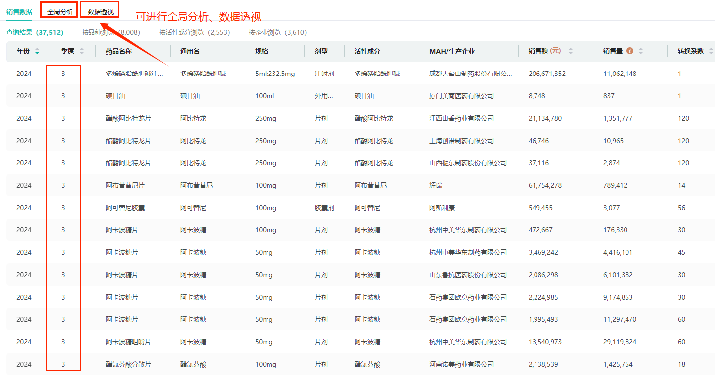 更新了2024年第三季度的药品销售数据,方便您实时分析竞争药品销售趋势,多维度评估竞品优劣势,监控终端市场高增长潜力品类、细分赛道,是您分析市场竞争格局,预测市场销售动态的得力助手。