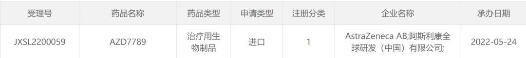 2022年5月24日,药审中心承办了阿斯利康的1类生物制品AZD7789的临床申请。