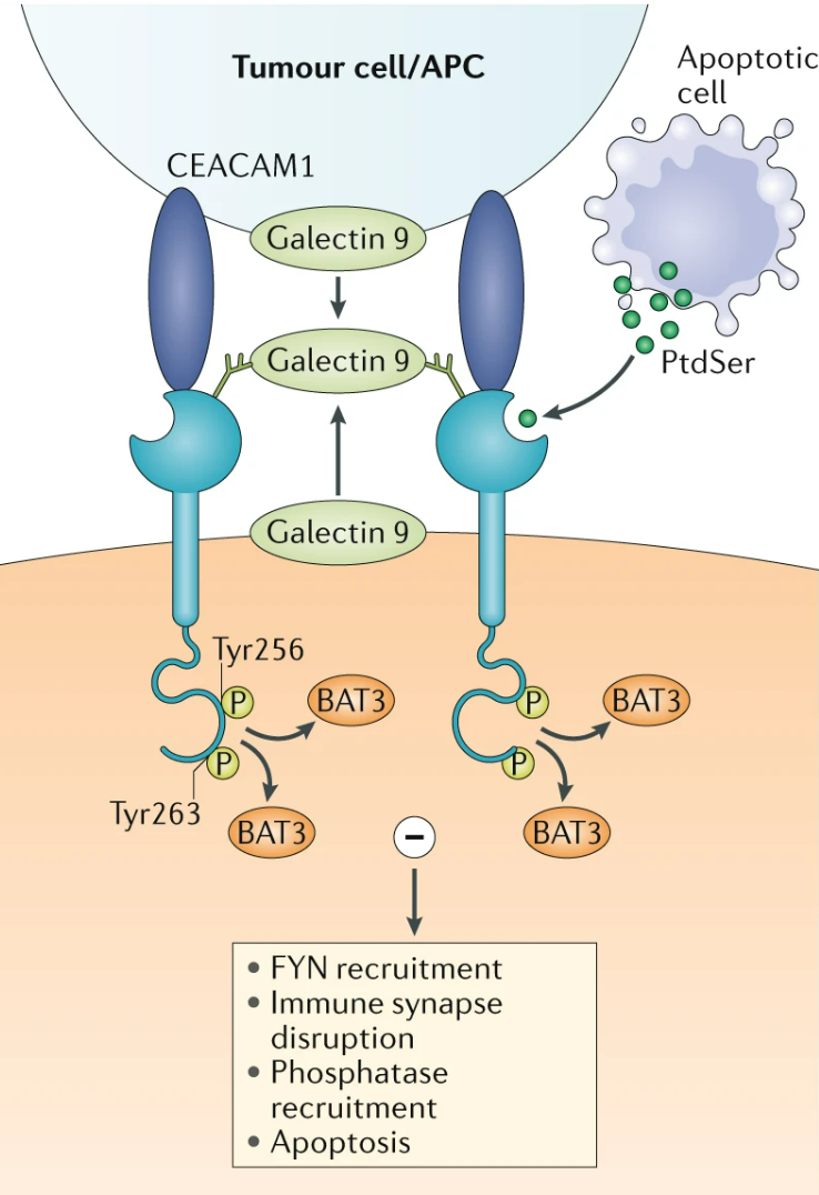 可溶性凝集素半乳糖凝集素9和粘附分子癌生物抗原相关细胞粘附分子1(CEACAM1)是TIM3的两种配体,通过酪氨酸激酶ITK触发Tyr256和Tyr263的磷酸化。磷酸化后,BAT3从TIM3中释放出来,从而使TIM3发挥其抑制功能。