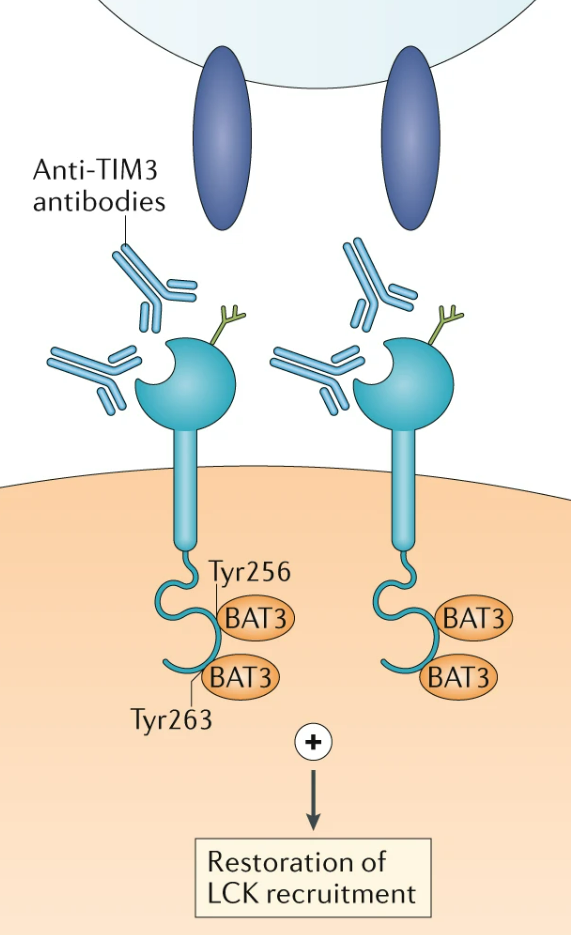 多数促进抗肿瘤免疫的TIM3靶向抗体干扰CEACAM1或PtdSer与TIM3的结合,从而维持TIM3-BAT3相互作用。