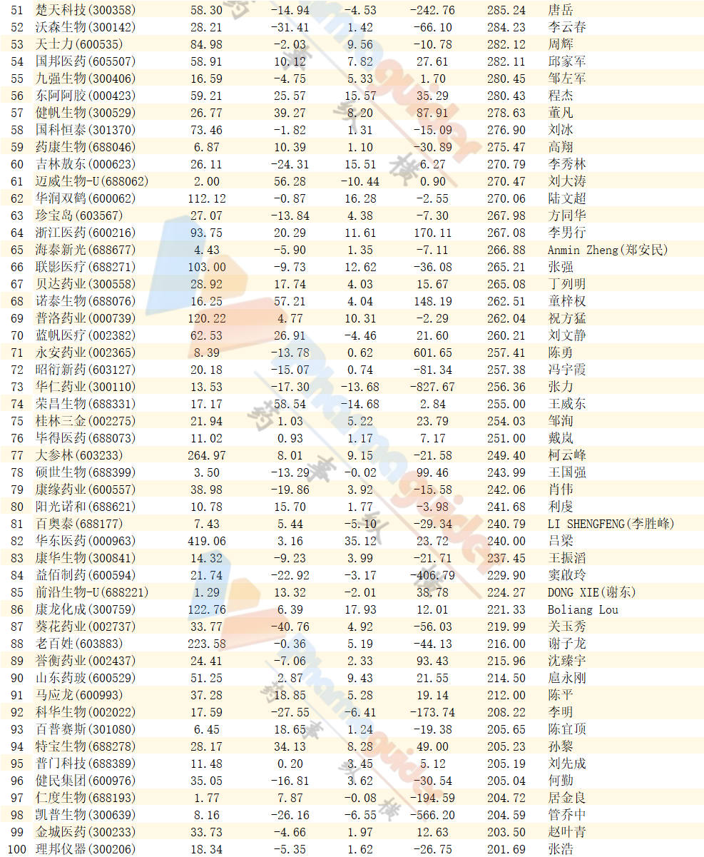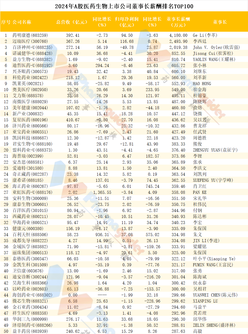 截止4月30日,A股上市的医药生物行业(按照申万行业分类)年报已经披露完毕,我们统计了2024年董事长薪酬情况,其中Top100如下: