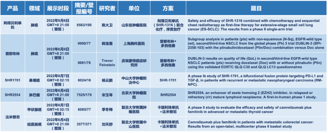 2022 ASCO年会另有5款恒瑞医药上市前抗肿瘤创新药的相关研究被接收为壁报,包括SHR-1316、普那布林、法米替尼、SHR-1701和SHR2554,他们的单药或联合方案相关7项研究被接收为壁报,覆盖肺癌、鼻咽癌、淋巴瘤、甲状腺癌和结直肠癌等领域。