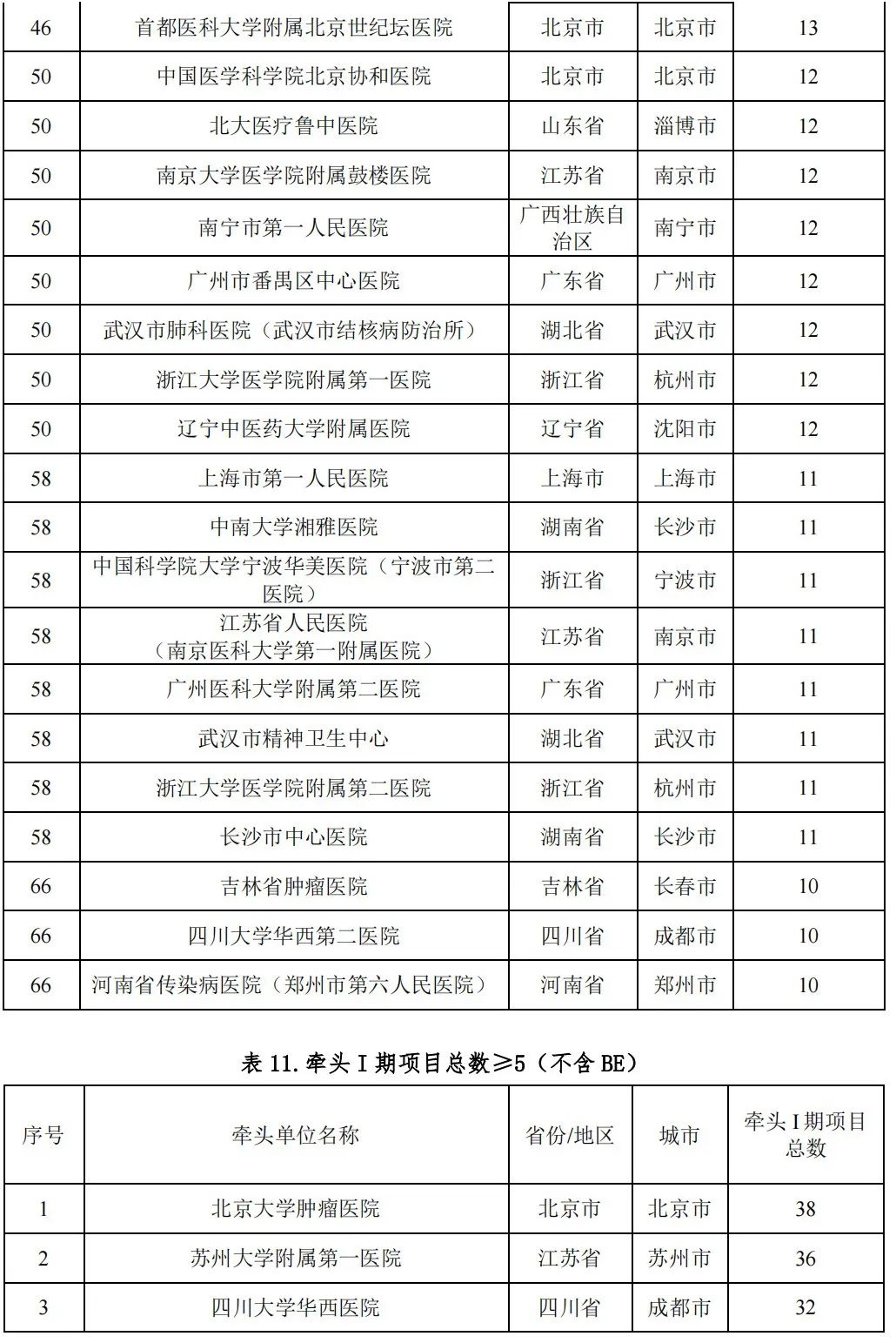 安徽济民肿瘤医院、吉林大学第一医院以及上海市徐汇区中心医院、安徽医科大学第二附属医院,分列前三,项目数量分别为48个、47个以及45个、45个。