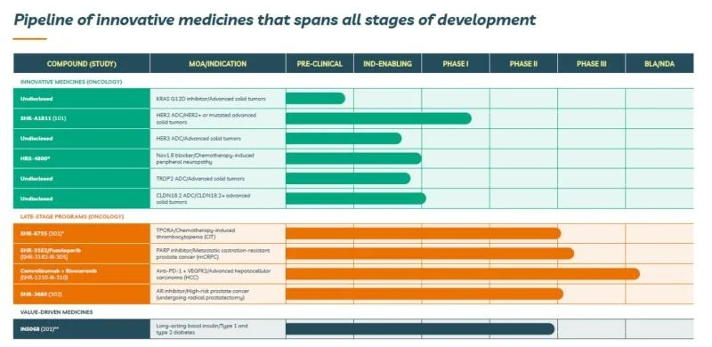 今年5月18日,恒瑞医药在海外成立全资子公司Luzsana Biotechnology。凭借独特的运营模式,Luzsana 旨在“降低药品成本”,并负责恒瑞医药管线产品的国际化(海外开发和商业化),Luzsana最初的管线集中在11个高潜力的项目上,包括肿瘤学、肿瘤学支持性护理和代谢学等各个开发阶段的高需求领域。除了PD-1抑制剂camrelizumab,公司后期的项目还包括PARP抑制剂fuzuloparib和雄激素受体拮抗剂SHR-3680。其早期的候选药物包括靶向HER2、HER3、TROP2 和 Claudin18.2 的四种抗体药物偶联物。