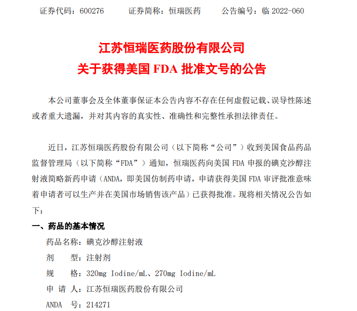 近日,江苏恒瑞医药股份有限公司收到美国FDA通知,恒瑞医药向美国FDA申报的碘克沙醇注射液ANDA申请已获得批准。根据美国竞争性仿制药疗法法案,恒瑞医药的碘克沙醇作为首仿,将获得180天市场独占期,有望成为恒瑞医药一款海外销售过亿美元的品种。