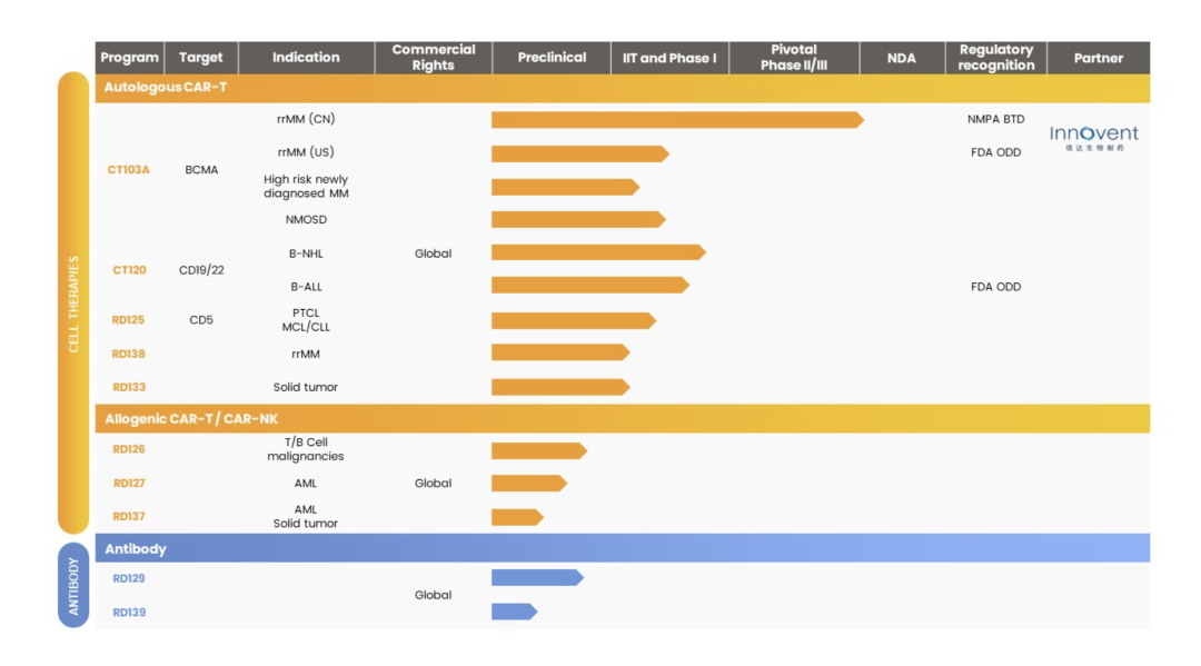 驯鹿生物是一家专注于细胞治疗和抗体药物开发和产业化的创新生物制药公司。驯鹿医疗以开发血液肿瘤细胞类药物和抗体药物为创新的基石,向实体瘤和自身免疫疾病拓展,拥有完整的从早期发现、注册申报、临床开发到商业化生产的全流程平台能力及包括了全人源抗体发现平台、高通量CAR-T细胞疗法药物优选平台、通用CAR技术平台、生产技术平台、临床转化研究平台在内的多个技术平台。驯鹿医疗现有10个在研品种处于不同研发阶段: