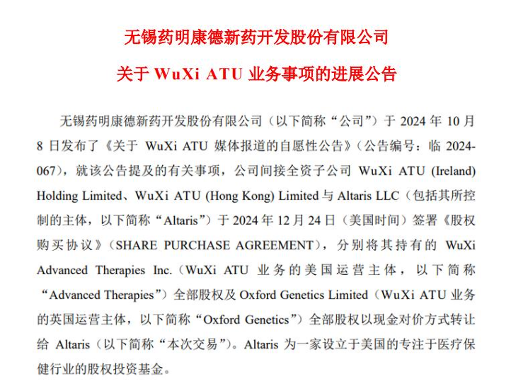 2024年12月24日,药明康德宣布将其间接全资子公司WuXi Advanced Therapies Inc.(WuXi ATU业务的美国运营主体)全部股权及Oxford Genetics Limited(WuXi ATU业务的英国运营主体)全部股权以现金对价方式转让给Altaris。