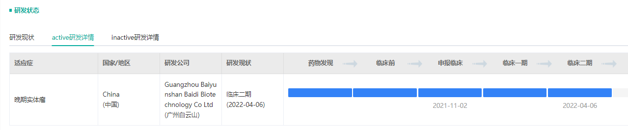 2022年5月30日,白云山制药发公告声称该分公司白云山制药总厂于2022年5月29日收到美国FDA同意其RET抑制剂药物——BYS10片用于治疗RET融合或突变的晚期实体瘤进行临床试验的通知函。根据药融云数据显示,BYS10在国内的临床试验已经进入II期。