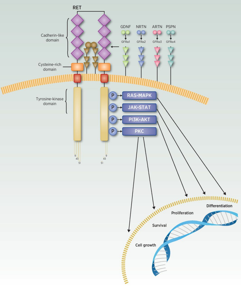RET与神经胶质细胞系衍生的神经萎缩因子(GDNF)家族配体——(GFLs)的配体-共受体复合物结合,然后将RET结合的复合物掺入富含胆固醇的跨膜亚结构域(称为脂筏)中,适配器和信号蛋白与经历过二聚化和自磷酸化的RET细胞内酪氨酸激酶残基结合。这些信号蛋白与对接位点磷酸酪氨酸1062(pY1062)和pY1096结合,导致RAS/丝裂原活化蛋白激酶(MAPK),RAS/细胞外信号调节激酶(ERK),磷脂酰肌醇3-激酶(PI3K)/AKT和c-JunN-末端激酶(JNK)等信号通路的激活。