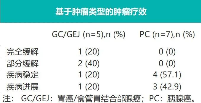 在靶向CLDN18.2 CAR-T细胞疗法(CT041)治疗晚期胃癌和胰腺癌患者的多中心1b期试验NCT04404595中,共招募了14个之前接受过至少两种前线系统治疗的胃癌/食管胃结合部腺癌(GC/GEJ)患者,以及至少接受过一种前线治疗的胰腺癌患者,显示了不错的安全性,未观察到剂量限制性毒性或治疗相关死亡。未观察到≥3级的CRS或ICANS。未发生胃肠道出血或急性胃粘膜损伤。11例为1级CRS,2例为2级CRS。有1例患者未发生CRS。