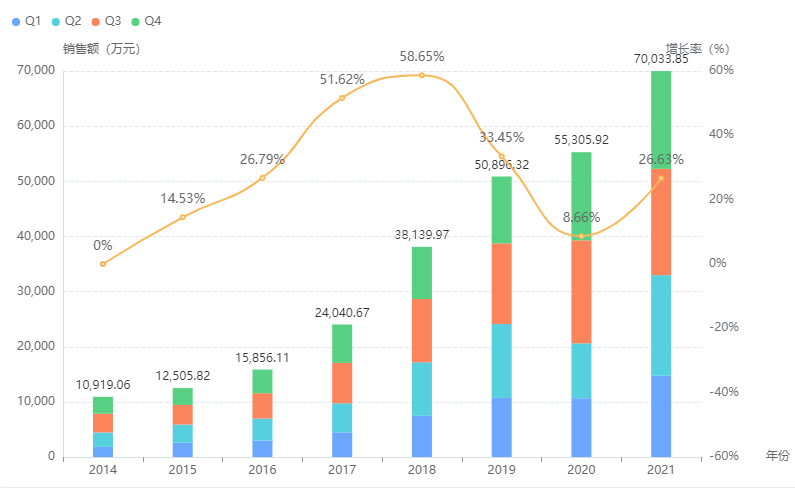 蛋白琥珀酸铁是第三代补铁剂,适用于治疗缺铁性贫血,包括由于铁摄入量不足或吸收障碍、慢性失血以及妊娠与哺乳期引起的缺铁性贫血。作为新型口服补铁剂,蛋白琥珀酸铁有更高的吸收率和生物利用度,同时具有释药稳定、无胃粘膜损伤的特性,而且相比传统补铁剂口感更佳。因此,该药上市后反响不错,销售也呈现高速增长。据药融云统计,2021年蛋白琥珀酸铁口服溶液院内销售额超7亿元,同比增长26.6%。有机构分析,蛋白琥珀酸铁口服溶液未来具备10亿元潜力。