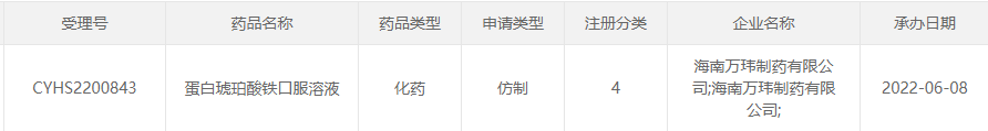 6月8日,据CDE官网显示,海南万玮制药递交的4类仿制化药蛋白琥珀酸铁口服溶液上市申请获受理。据查询,这是首家以新注册分类申报该7亿补铁剂品种的企业。