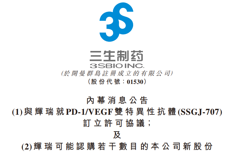 5月20日,三生制药发布公告,公司与辉瑞就PD-1/VEGF双特异性抗体(SSGJ-707)订立许可协议。