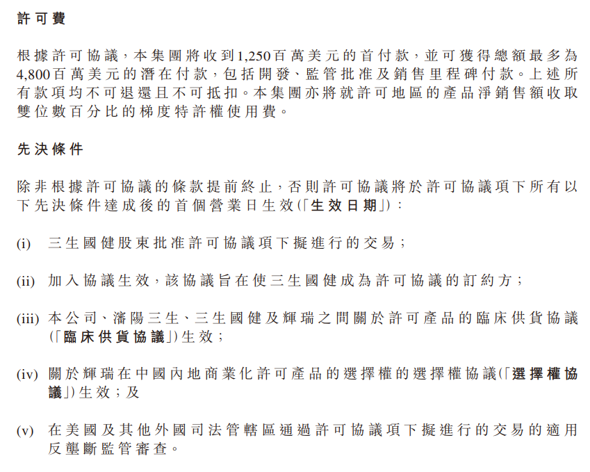 根据许可协议,三生制药将收到12.50亿美元的首付款,并可获得总额最多为48亿美元的潜在付款,包括开发、监管批准及销售里程碑付款。上述所有款项均不可退还且不可抵扣。此外,三生制药还将就许可地区的产品净销售额收取双位数百分比的梯度特许权使用费。