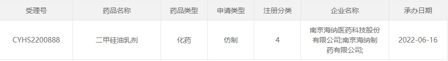 目前,国内尚无相关二甲硅油品种过评。此次南京海纳递交的二甲硅油乳剂上市申请获受理,为首家以新注册分类申报二甲硅油的企业。