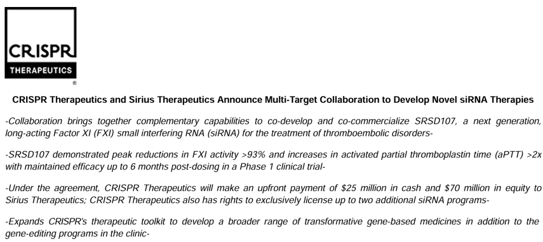 CRISPR Therapeutics董事长兼首席执行官Samarth Kulkarni博士表示:“我们很高兴与靖因药业建立合作关系,并在近期公布的CTX310项目(靶向ANGPTL3)令人振奋的顶线数据基础上,进一步拓展我们在心血管疾病领域的管线布局。凝血因子XI是一个创新且极具吸引力的靶点,在治疗影响全球数以百万计患者的血栓性疾病方面展现出巨大潜力。SRSD107有望成为同类最佳疗法,凭借更低的给药频率和更优的临床获益,为临床治疗带来重大突破。靖因药业在siRNA平台方面的前沿技术与我们现有的研发能力高度互补,进一步丰富了我们的治疗技术平台,助力我们开发更广泛的变革性基因疗法。”