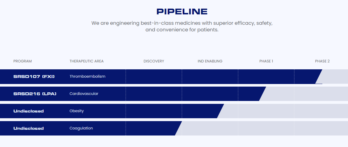 SRSD107是一款新一代的长效siRNA疗法,旨在选择性抑制凝血因子XI(FXI)。FXI靶点在病理性血栓形成中起关键作用,但对正常止血功能的影响较小。通过靶向FXI,SRSD107有望在降低血栓事件发生的同时,显著减少出血风险,展现出有别与凝血因子X活性(FXa)抑制剂的治疗优势。SRSD107的潜在适应症广泛,包括房颤、静脉血栓栓塞症(VTE)、肿瘤相关性血栓、接受血液透析的终末期肾病患者,以及因出血风险限制现有治疗手段的重大骨科手术人群。