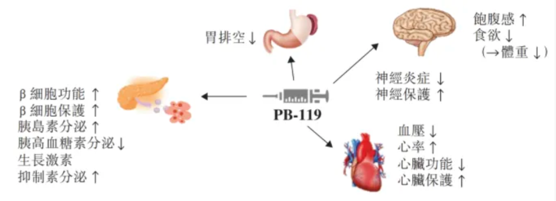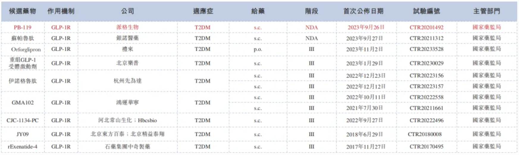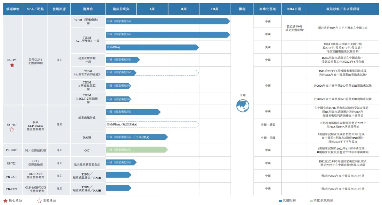 PB-119主要用於T2DM及肥胖症一线治疗。其已于多项临床试验中显示出在血糖控制、心血管健康等方面的多种益处,以及对体重管理的良好效果。长效GLP-1受体激动剂是指需要每週一次给药方案的产品,如PB-119,而短效GLP-1受体激动剂则需要每日一次或多次给药方案。PB-119在中国用于治疗T2DM的新药上市申请(「NDA」)于2023年9月获中国国家药监局(NMPA)受理。