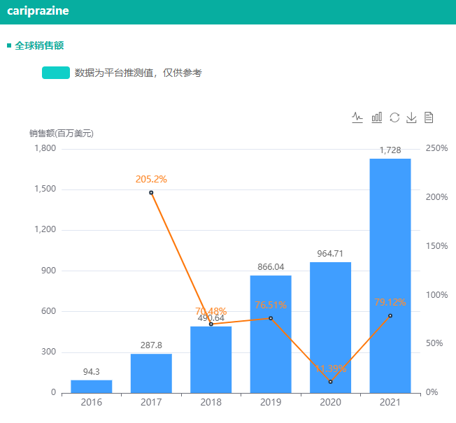 盐酸卡利拉嗪胶囊(Cariprazine hydrochloride Capsules)原研来自艾伯维,用于治疗成人精神分裂症,最早于2015年在美国批准上市,后于2017年7月获批在欧盟上市。据药融云估算,2021年,盐酸卡利拉嗪全球销售额超17亿美元,同比增长79%,增长势头迅猛,且还在扩展新适应症,被誉为精神类潜在的重磅产品。