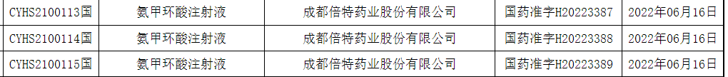 目前,氨甲环酸注射液已有瑞阳制药(仿制药首家过评)、成都利尔药业、山西普德药业、扬子江药业、湖南赛隆和此次的成都倍特药业等6家企业过评,成都市海通药业、广州一品红制药/成都百裕制药、广东星昊药业、吉林四长制药等多家企业已递交该品种的新注册分类上市申请或仿制药一致性评价补充申请。