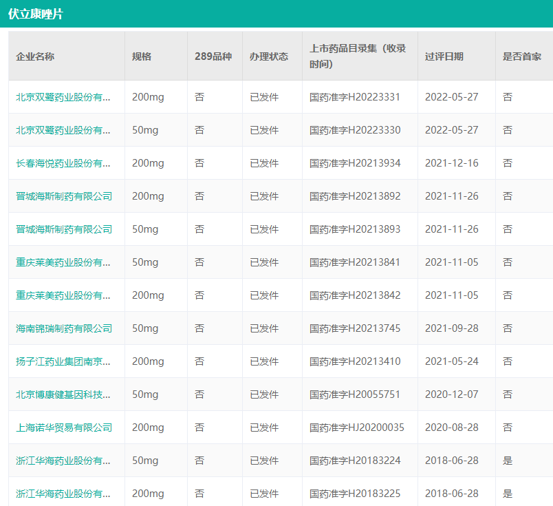 伏立康唑片已过评企业(截至2022.06.19)