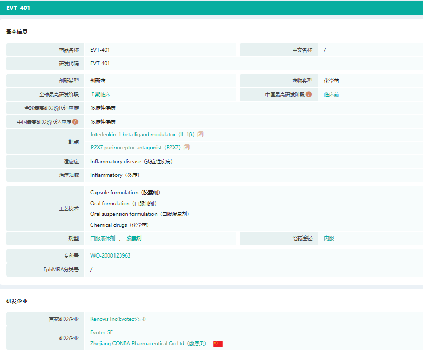 据药融云数据库显示,EVT-401是白细胞介素1β配体(IL-1β)调节剂和嘌呤受体P2X7受体拮抗剂,主要用于炎症性疾病:镇痛(急性、炎性和神经性疼痛、慢性痛、牙痛、头痛);炎症介导的疾病和障碍(关节炎、类风湿性关节炎等);神经炎症介导的疾病和障碍(创伤性脑损伤、脑炎等);呼吸和气道疾病和障碍(过敏性鼻炎、哮喘、反应性气道病和COPD等及多发性硬化等)。EVT-401原由Evotec AG 旗下全资子公司Renovis Inc.研发,是有希望的first in class药物,2012年,浙江康恩贝与Renovis展开合作,共同开发此款药物。