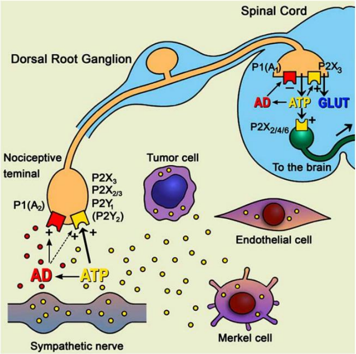 ATP不仅是人体细胞能量的来源,也可以作为外周和中枢神经系统神经的共递质,嘌呤受体广泛表达于非神经元和神经细胞上。ATP的细胞外作用分神经元和非神经元两个方面,非神经元作用主要是作用于各组织器官(心脏,血管,呼吸,胃肠道,泌尿系统)的平滑肌细胞,引起平滑肌收缩,也可以用于血管内皮细胞,中枢神经胶质细胞,免疫细胞等部位。在神经元方面可以作用于外周神经纤维(ATP有强致痛作用,并且Zn2+/H+SP和BK等致痛物质都可以通过增强P2X受体功能,进一步增强ATP激活电流的作用,增强对伤害性信息的感受)。