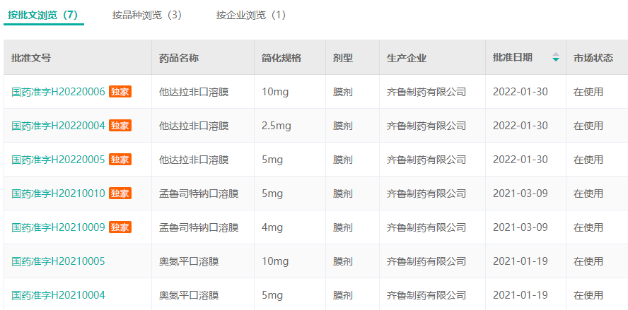至此,齐鲁制药共有5款口溶膜产品获批上市,此前已有他达拉非口溶膜、奥氮平口溶膜和孟鲁司特钠口溶膜陆续获批。此外,还有利培酮口溶膜、盐酸伐地那非口溶膜、草酸艾司西酞普兰口溶膜等3款口溶膜产品已获得临床批件;其磷酸奥司他韦口溶膜的临床申请也已于2022年4月18日获CDE受理。