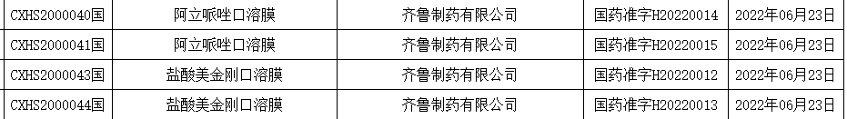 6月24日,NMPA发布最新一批药品批准证明文件待领取信息,其中齐鲁制药2款口溶膜产品同日获批,分别为阿立哌唑口溶膜和盐酸美金刚口溶膜,均为国内首款。