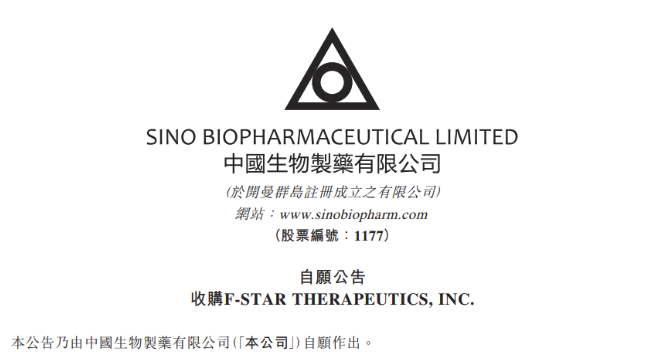 2022年6月23日晚间,中国生物制药(HK:1177)发布公告,将收购纳斯达克上市公司F-star Therapeutics,Inc所有发行在外的普通股,总代价为1.61亿美元(约合10.7亿人民币),每股7.12美元。