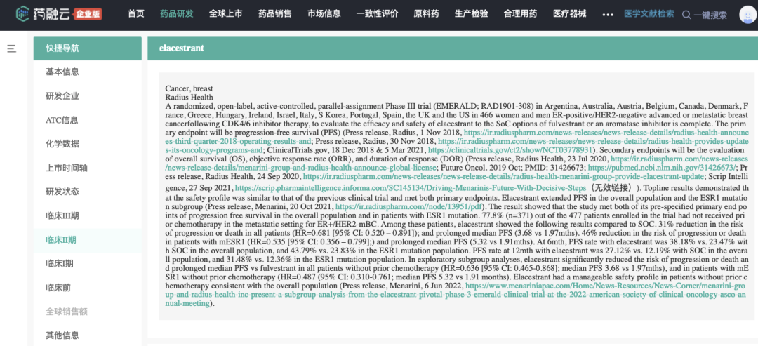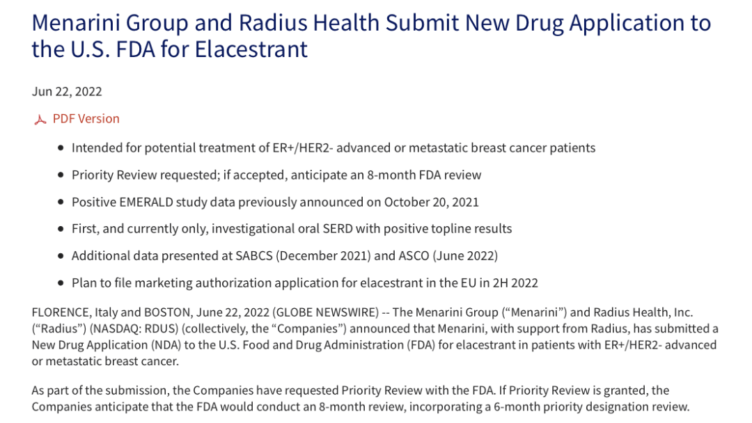 2.2022年6月,美纳里尼(Menarini Group)和方圆健康(Radius Health, Inc.)(统称"公司")宣布,在Radius的支持下,美纳里尼已经向美国FDA 提交了治疗ER+/HER2-晚期或转移性乳腺癌患者的新药艾拉司群(Elacestrant)(RAD1901)的新药上市申请(NDA)。