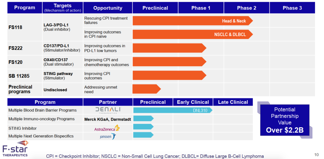 F-star Therapeutics的主要候选新药产品有:FS118,PD-L1/LAG-3双抗,目前正在进行头颈癌2期临床试验以及NSCLC、DLBCL适应症临床试验。FS222,4-1BB/PD-L1双抗;FS120,OX40/4-1BB双抗等等。