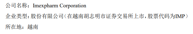 资料显示,IMP在越南胡志明市证券交易所上市,作为越南领先的医药企业,其主要从事药品的研发、生产和销售,其产品主要包括抗生素、心脑血管药物等。