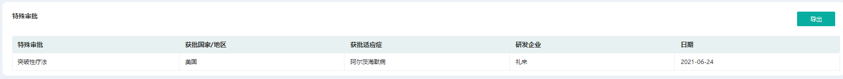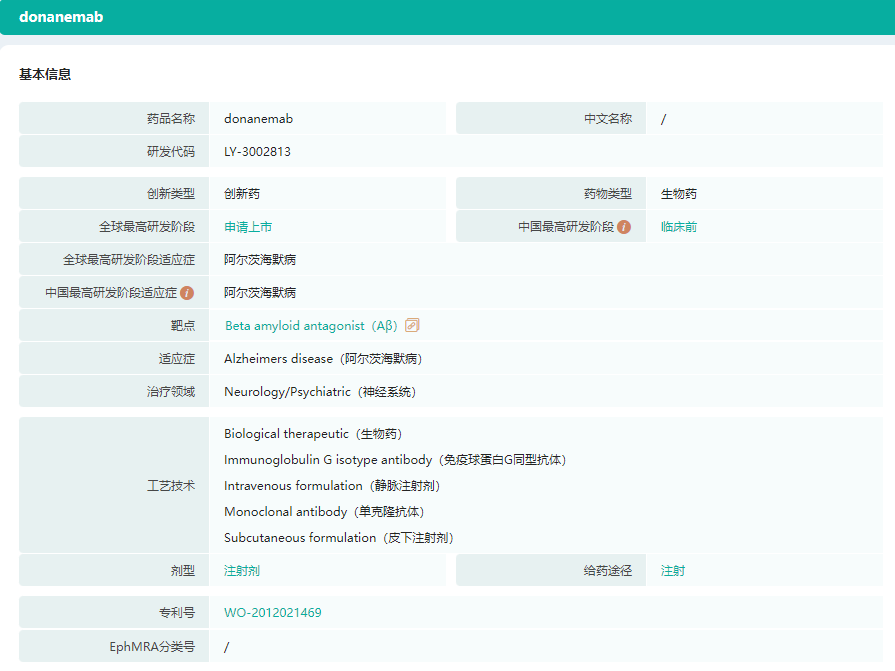 经药融云数据库查询,donanemab是礼来开发的一款靶向β淀粉样蛋白(Aβ)斑块的抗体药物,针对神经系统的阿尔茨海默病。该药于2021年6月,还获得了FDA的突破性疗法认定。