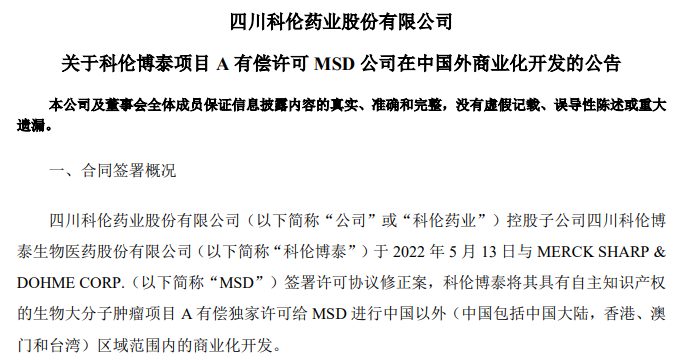 值得一提的是,5月16日,科伦药业宣布与美国默沙东签订协议,将具有自主知识产权的生物大分子肿瘤项目A的大中华区以外权益以4700万美元首付款(以及不超过13.63亿美元的里程碑付款和产品上市后的净销售额提成)许可给默沙东。于本协议修正案签署后收到3000万美元一次性、不可退还的付款,里程碑付款累计不超过13.63亿美元,并按双方约定的净销售额比例提成。据科伦药业最新公告,双方合作按既定计划正常推进中,科伦博泰已于2022年6月24日收到MSD支付的3,000万美元付款。