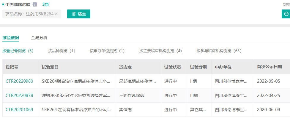 据药融云查询,目前SKB264共递交了5项临床试验申请(IND),其中3项已获得中国国家药品监督管理局批准,包括单药用于治疗晚期实体瘤、SKB264联用KL-A167分别用于治疗晚期或转移性非小细胞肺癌和三阴性乳腺癌、单药用于至少经二线治疗失败的晚期或转移性三阴性乳腺癌患者的Ⅲ期注册临床试验。目前,SKB264在国内的最高进展为III期临床试验。