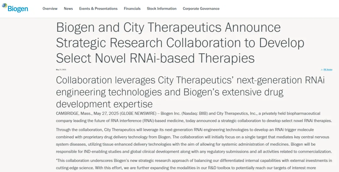 近日,Biogen宣布与一家生物制药公司City Therapeutics达成战略合作,开发新型RNAi疗法。