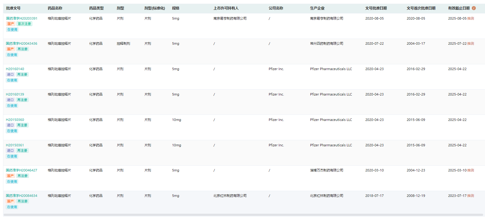 经药融云数据库查询,格列吡嗪控释片目前在使用的药品批文有8条,其中原研辉瑞就有4条。国内药企持有格列吡嗪控释片药品批文的有4家,分别是淄博万杰制药、北京红林制药、常州四药制药、南京易亨制药。格列吡嗪控释片开发难度依然很大,所以此前,国内通过一致性评价的很少,只有2家企业:南京易亨制药有限公司格列吡嗪控释片2020年8月5日获批,北京红林制药有限公司格列吡嗪控释片2021年1月13日获批。此次的上海安必生制药的格列吡嗪控释片视同过评,拿下国内第三家。