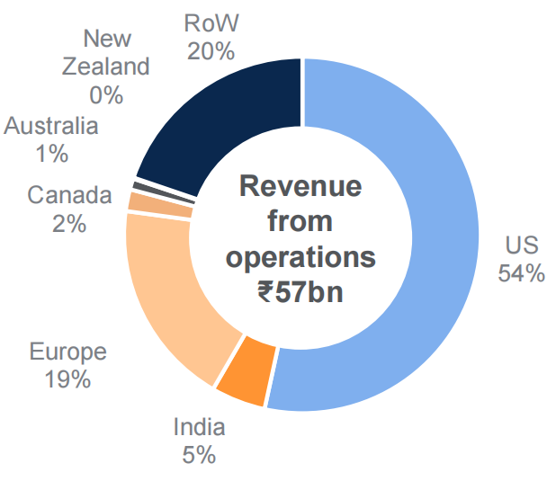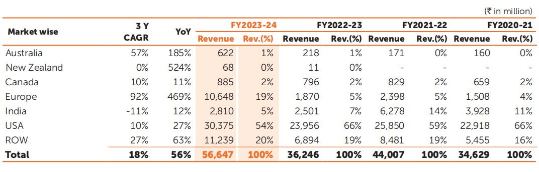 Gland Pharma主打欧美市场。2024财年(2023年4月1日至2024年3月31日),集团总收入中有54%来自于美国,19%来自于欧洲,远超印度本土和全球其他地区。
