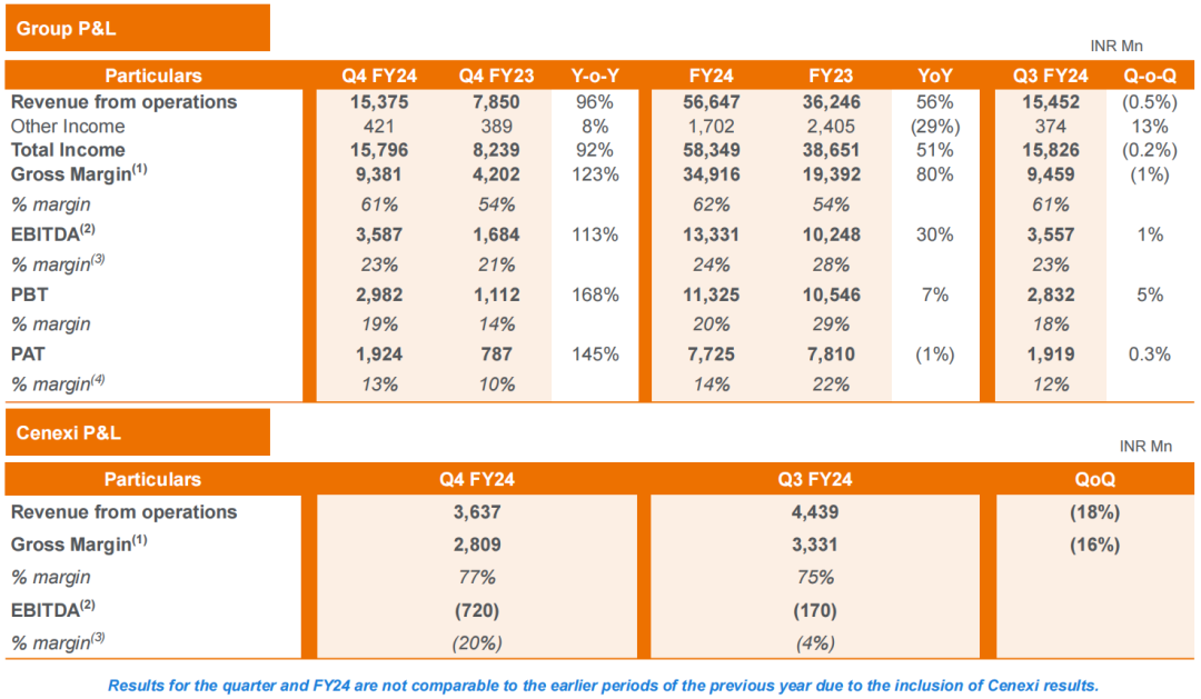2024财年(2023年4月1日至2024年3月31日),Gland Pharma集团业务总收入达到了566.47亿卢比(6.8亿美元),同比增长56%,这一增长主要得益于Cenexi的整合以及基础业务(非Cenexi业务)的强劲表现。全年合并EBITDA为133.31亿卢比(1.6亿美元),同比增长30%;税后利润77.25亿卢比(0.93亿美元),每股收益47卢比(0.56美元)。【汇率按照1卢比=0.012美元】