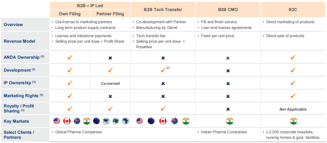 Gland Pharma在全球市场主要采用B2B(企业对企业)的商业模式,辅以印度本土市场的B2C(企业对消费者)模式,在复杂注射剂的药物研发、生产和营销方面拥有卓越的业绩记录。Gland Pharma与全球合作伙伴的合作模式包括对外许可、技术转移、合同制造;在印度本土市场通过由200多名员工组成的现场团队,与约2000家综合医院、政府卫生中心和疗养院有接触点的分销网络,联系超过25000名医生,是多个中央医疗机构的首选供应商。