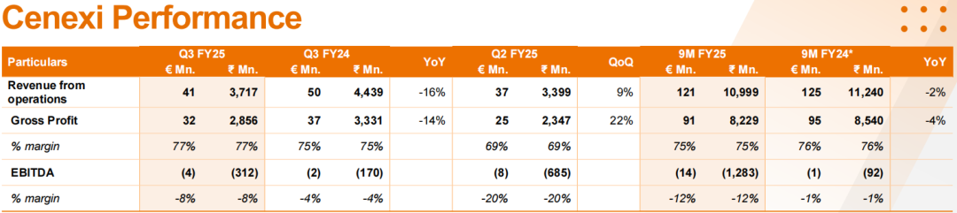 2025财年前三季度(2024年4月1日至2024年12月31日),Gland Pharma业务总收入419.16亿卢比(5.03亿美元),同比增长2%;合并EBITDA为92.14亿卢比(1.11亿美元),同比减少5%。前三季度基础业务(非Cenexi业务)收入309.17亿卢比(3.71亿美元),同比增长3%;Cenexi业务收入1.21亿欧元(109.99亿卢比),同比减少2%。